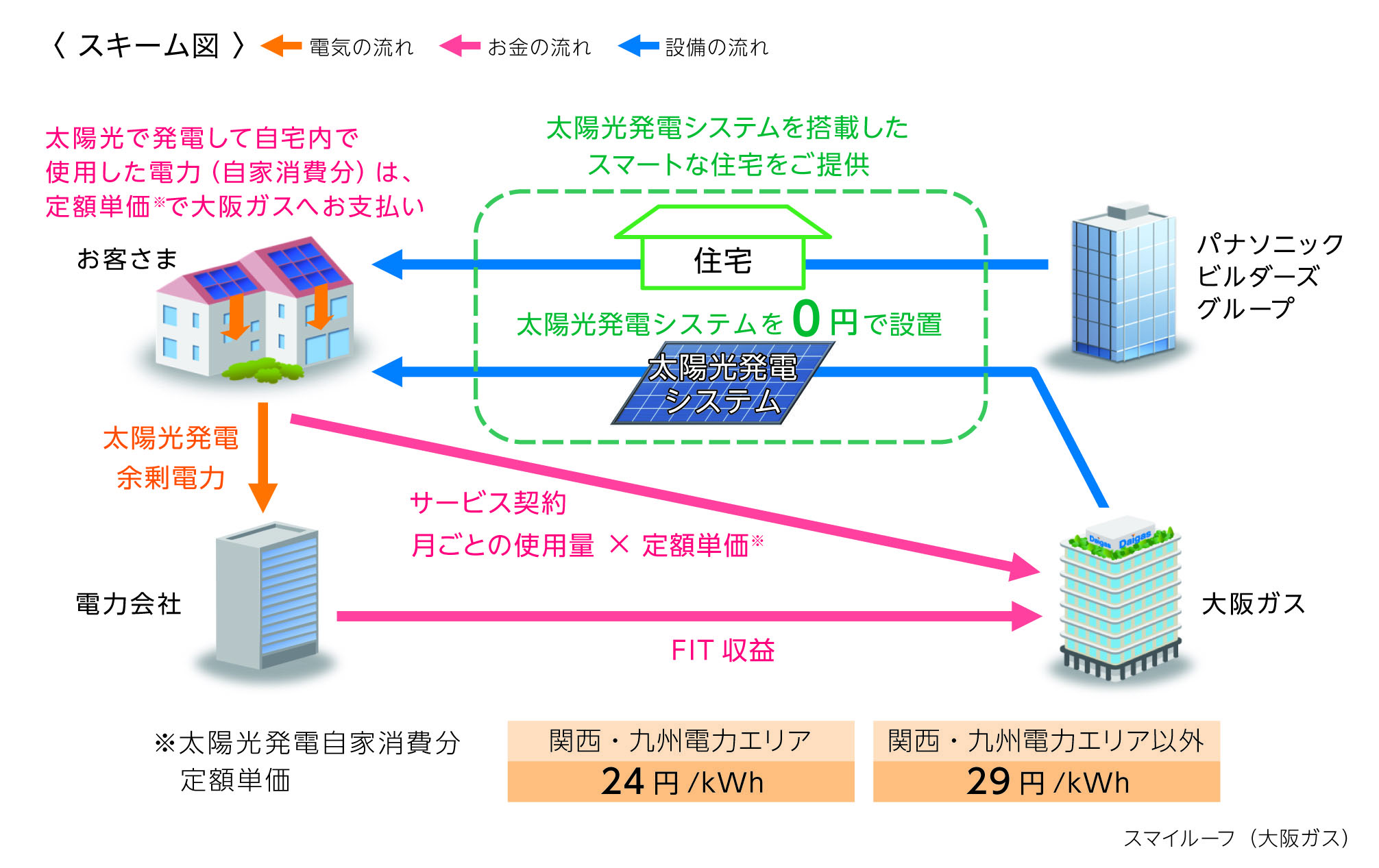 大阪ガスに入ります。また、発電した電気のうち、お客さまが使った電気料金の支払いをシステム設備費に充てます。