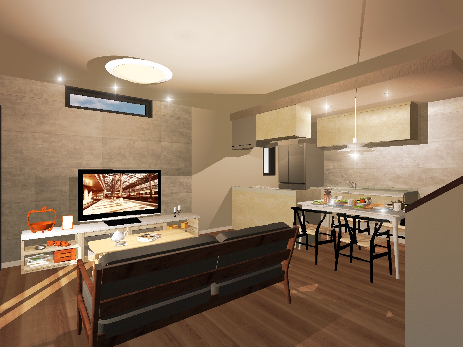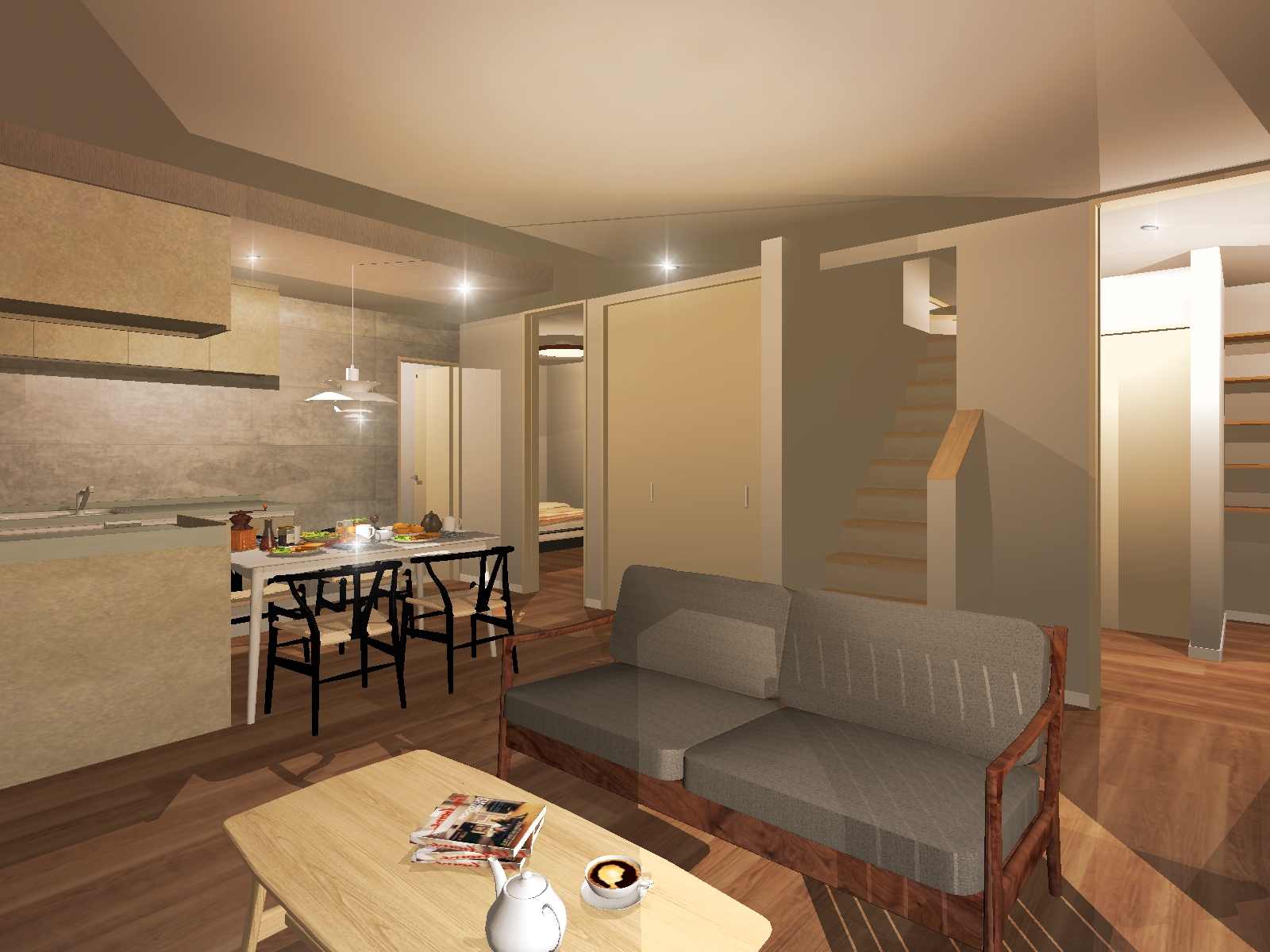 リビング階段家族団らんの空間を優先にしております。二の字型のキッチンでリビング空間を広めに設けております。